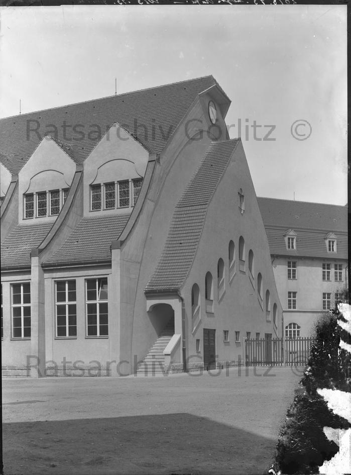 Turnhalle - Rückansicht der Oberrealschule und des Reform-Realgymnasiums Ecke Lessingstraße / Seydewitzstraße, Höhere Schule
